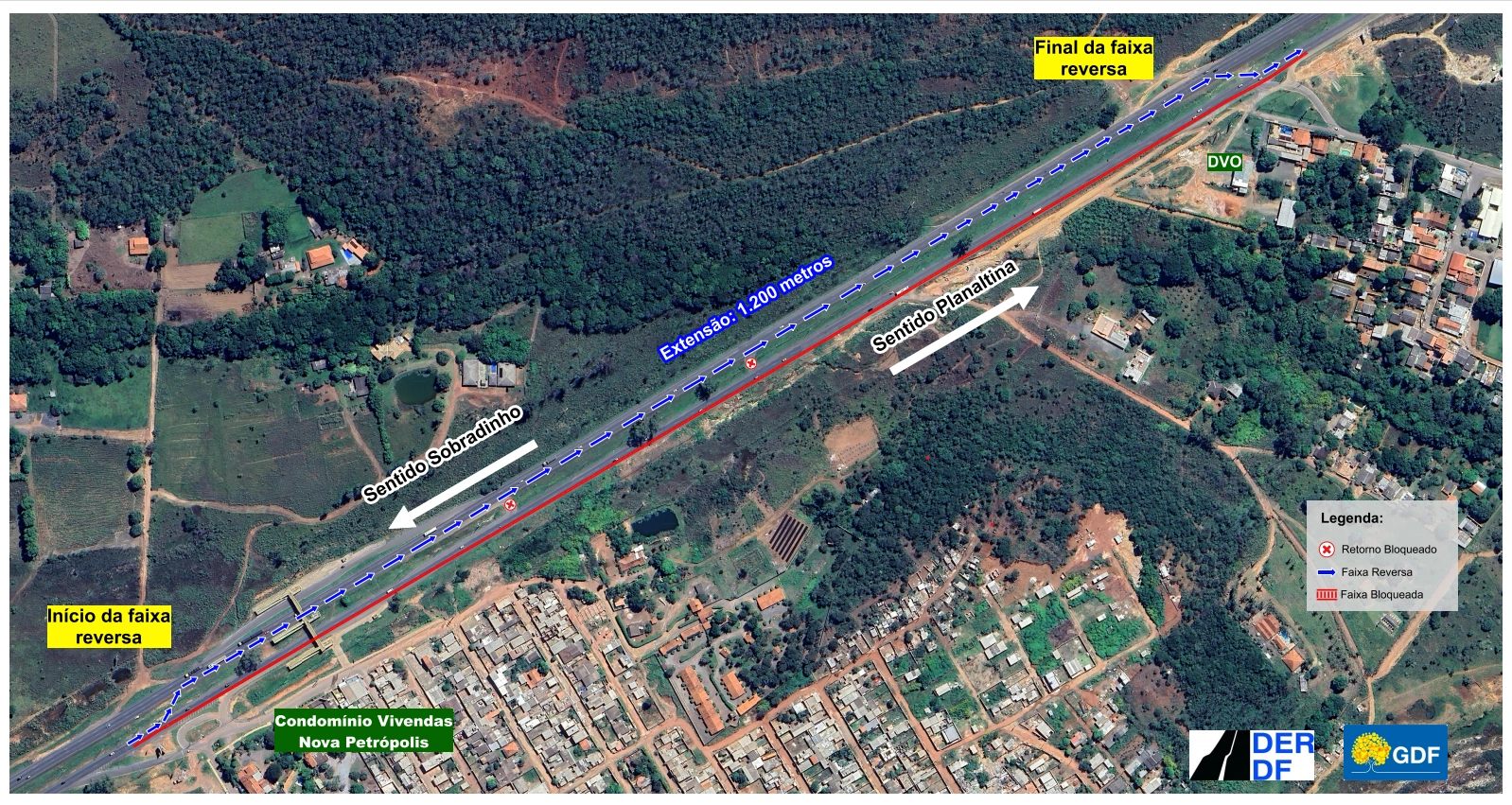 A intervenção ocorrerá no trecho entre o Km 16,1 e o Km 17,3, com a criação de uma faixa reversa no sentido Sobradinho-Planaltina. O trecho de faixa reversa já existente entre o Km 10,4 e o Km 12,8, no mesmo sentido, seguirá em operação.
